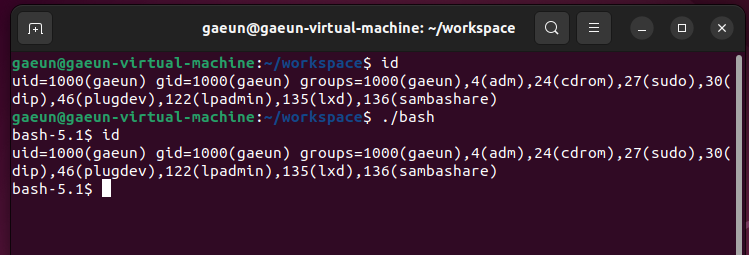 ⚠️하지만, bash 커맨드 실행할 때, 셸의 EUID는 일반 사용자 유저인 1000이다.